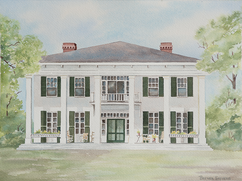 Here is the 2nd house portrait for the previous client. Every summer the family moved four miles outside of town to this beautiful country home. You will notice I used the same color scheme for both houses, complimenting each other if they were hung together. In the small, black and white reference photo, most of the face of the house was obscured by trees. Luckily, I could see part of one upstairs’ window and because the house is very symmetrical, I was able to determine where the other windows and chimney should be placed.
