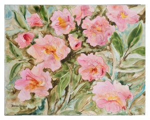Yupo for watercolor is the surface I’ve been working on since Christmas. I started making Christmas cards with it and had so much fun I decided to try a larger painting. If you want to catapult yourself out of your comfort zone, Yupo takes “happy little accident” to a whole new level. Its smooth, water resistant surface is quite the challenge. The water doesn’t soak in, it has to evaporate, and taking dry paint back to the white of the paper is so easy it’s hard to avoid doing it. Camellia on Yupo, 14 x 11.